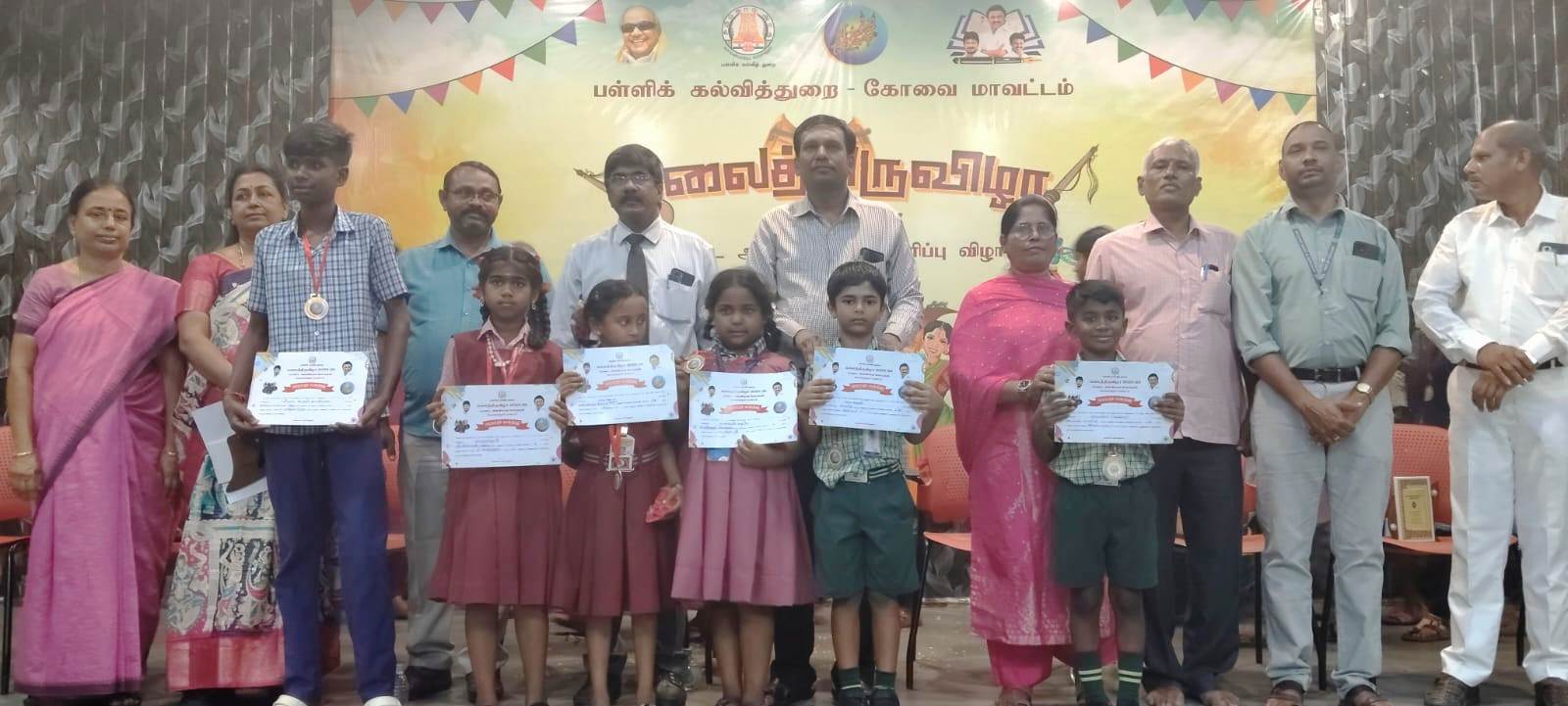 Six prizes (Two First Prizes, One Second Prize & Three Third Prizes) were received for the Kalai Thiruvizha Competition 2025-2026, in the district level, from the Chief Education Officer, Coimbatore, on 24th February 2026, at Hindustan College of Arts & Science, Peelamedu.