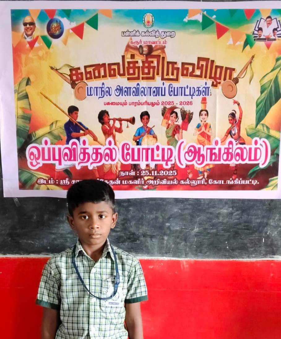 “State Level Kalai Thiruvizha- Art & Literary Competition – 2025 -2026” was  conducted on 25th November 2025 at Sri Saratha Niketan College of Science for Women, Karur, organized by TN Education Department.  Two pupils from our school participated in Story Telling and Rhymes Recitation.