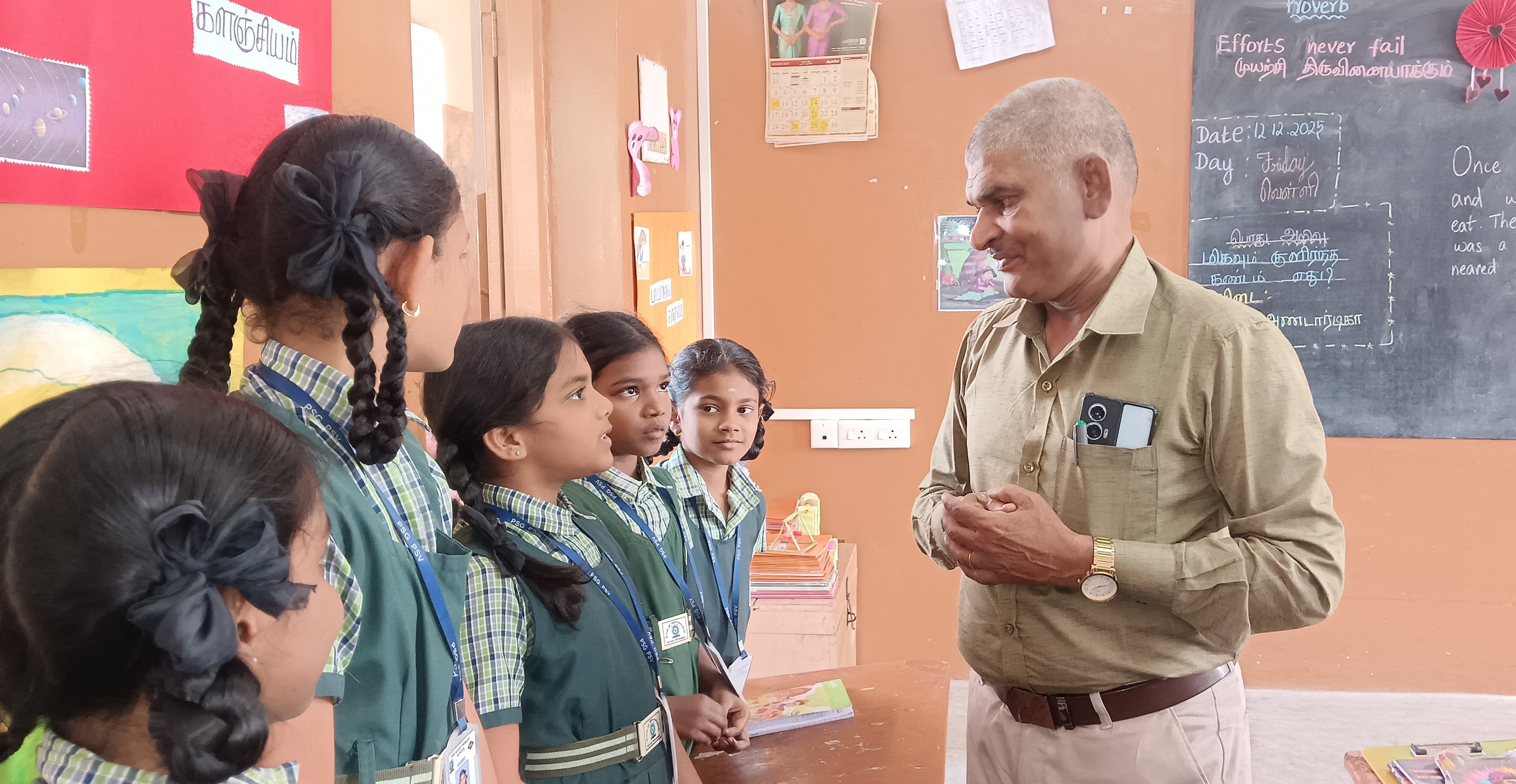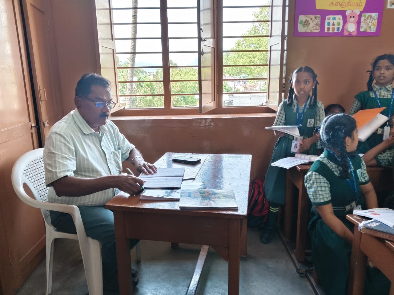 Mr.Ravichandran, D.E.E.O.(District Elementary Educational Officer) of Coimbatore Education District visited the school on 26th August 2025, and inspected the records of pupils & teachers and encouraged them to focus more on language reading, Mathematics & note corrections in Class.